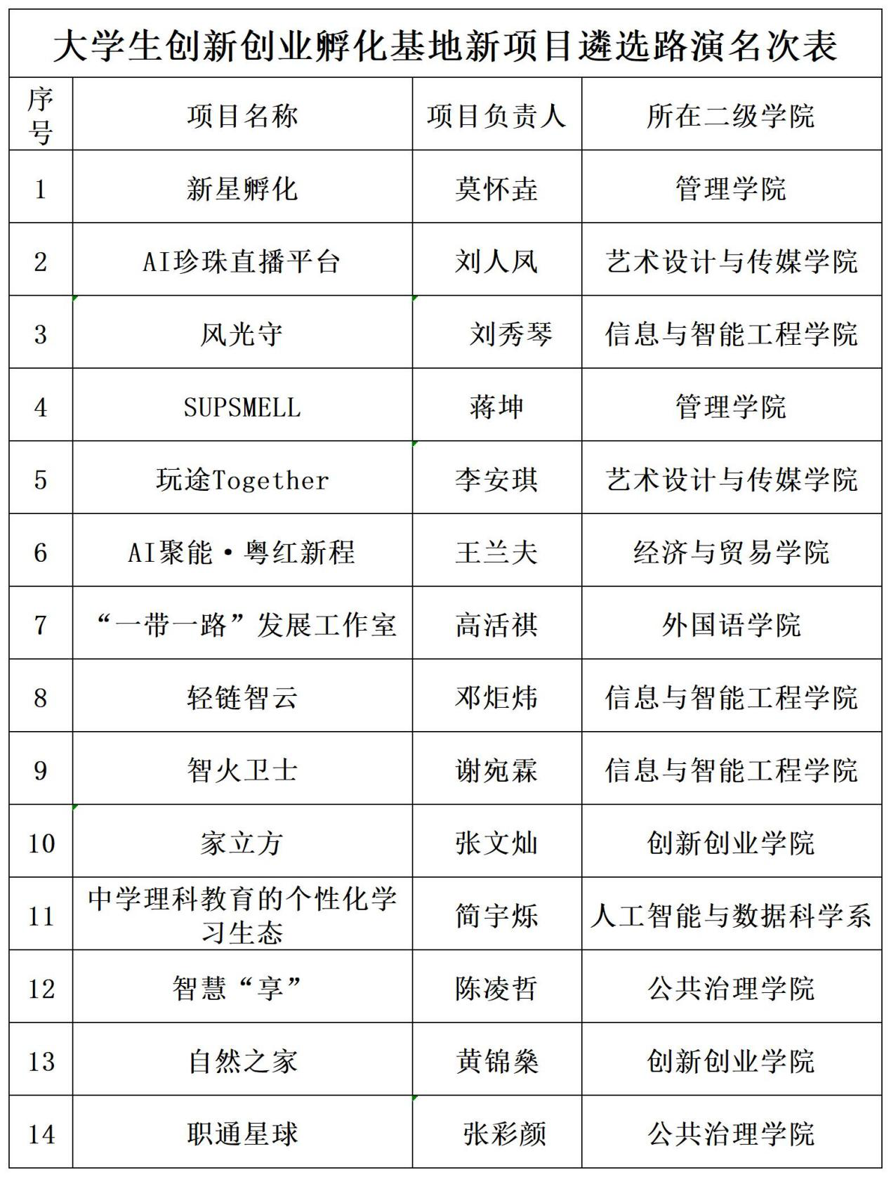 为深入贯彻落实国家“双创”战略,激发学生创新潜能与创业活力,广州新华学院大学生创新创业孵化基地于近期成功举办了新项目遴选路演活动。经专家评审、现场答辩、综合评分等环节,现将本次路演最终排名及拟入驻孵化基地项目名单予以公示。